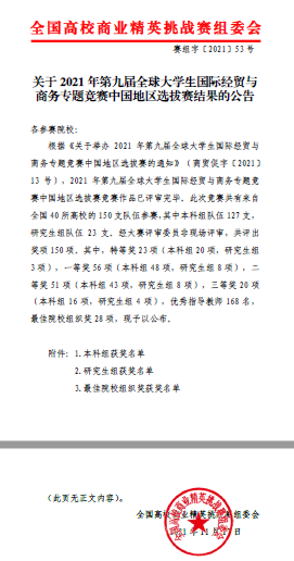 2021年第九届全球大学生国际贸易与商务专题竞赛中国赛区选拔赛由中国国际贸易促进委员会和中国国际商会商业行业商会主办,此次竞赛共有来自全国40所高校的150支队伍参赛,其中本科组队伍127支,研究生组队伍23支。经大赛评审委员非现场评审,经管国际商务专业第五婉悦等同学共同撰写的《碳中和背景下中国出口贸易结构优化分析》、黎倩倩等同学共同撰写的《后疫情时代的中国运动品牌竞争力分析》荣获特等奖;杨田地和蔡洁同学各自组队撰写的论文《中国船舶出口贸易的机遇和挑战》和《数字货币创造国际货币体系的新发展道路》均荣获一等奖;另有李响和徐彬同学各自组队的2支参赛队伍,其论文荣获二等奖。同时我校也荣获“最佳院校组织奖”。