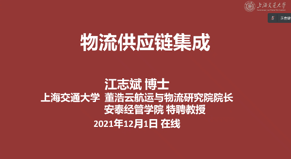 2021年12月1日,我院物流管理系教师通过线上腾讯会议的方式,参加了上海交通大学中美物流研究院物流工程与管理系列讲座的第一讲《物流供应链集成》。主讲人为上海交通大学安泰经管学院特聘教授江志斌。