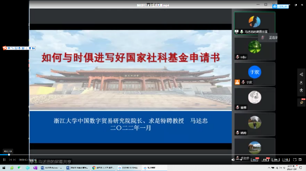 第四期1月18日,学院邀请了来自浙江大学的马述忠教授做讲座,讲座以腾讯会议方式在线上进行。 马述忠教授的报告内容主要是关于国家基金申报的国家战略背景及习近平总书记重要语录思考、基金项目申报的选题思考及学科归类、基金项目申报的问题导向及框架思路、基金项目申报书撰写过程中的心态调整。 会后大家就撰写申报书积极提问,并与马教授展开了热烈讨论。