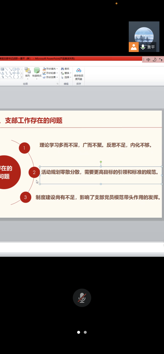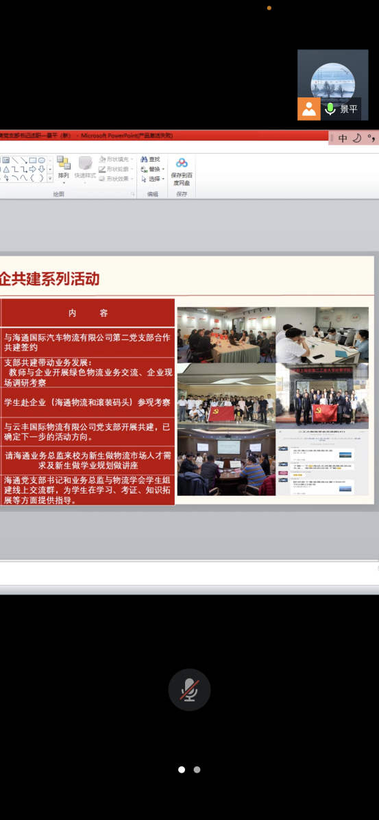 根据中组部和市委组织部的指示,2022年3月24日经管学院物流电商教师党支部在线上开展了“2021年度基层党组织组织生活会和民主评议党员”工作,支部书记景平和所有物流电商支部党员教师参加了此次支部活动。会议从利用多样化学习方式和载体将党史学习融入日常;深入学习研讨,深刻领悟思想;多渠道党课学习,成为党史学习的“加油站”;理论引领下的充分践行,促进党员先锋模范作用的发挥;聚焦师生所需,为群众办实事;党建和业务工作相互促进,协调发展;校企共建系列活动等七个主题总结了2021年度物流电商党支部的基本学习活动内容、特色、成效以及存在的问题和整改措施。