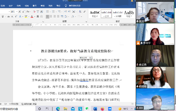 3月29日,经济与管理学院中心组线上开展疫情防控主题政治理论学习。学习内容包括:“教育部提出8要求,做好当前教育系统疫情防控”、上海市“把疫情防控作为当前头等大事,坚决打赢疫情防控阻击战”、上海市“特殊时期拿出特殊精神体现特殊担当”、习近平总书记在中央政治局常委会会议上的重要讲话“始终坚持人民至上、生命至上 尽快遏制疫情扩散蔓延势头”。通过学习不同层面关于疫情防控的要求和举措,不仅有助于我们更好地理解和掌握新形势、新要求,更重要的是再次坚定我们为全院师生员工做好服务和保障工作的信念。学院党委成员在疫情防控中冲锋在前,党委书记姚莉和党委副书记杨聪聪在学校封闭管理时,第一时间返回学校靠前指挥积极组织在校师生抗疫。党委副书记、院长卓武扬在居家隔离时经常工作到深夜,在解封后第一时间返回校内,由于匆忙,连常规的用品都没带全。他们体现出了党的干部在特殊时期的特殊精神和特殊担当!