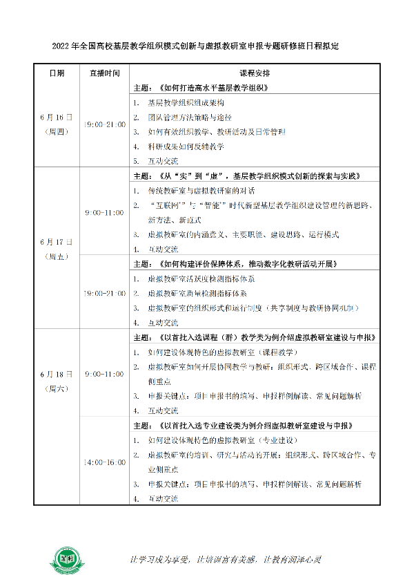 2022年6月16-18日,经管学院教学副院长潘海兰、电商专业负责人羊英、国商专业负责人燕春蓉、会展专业负责人辜应康、投资专业负责人贺书锋参加了全国高校基层教学组织模式创新与虚拟教研室申报专题研修班,主讲分别来自清华大学、哈尔滨工程大学、山东大学、西南大学、北京师范大学五所高校的教授专家,从基层教学组织的建设路径、模式创新到课程类、专业类虚拟教研室的申报、建设等多方面全方位开展经验介绍,为经管学院各专业今后在这两个方面的建设有很大的启发意义。