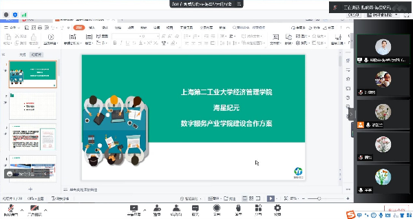 2022年6月30日,经管学院与海星纪元就“上海数字服务产业学院”建设的合作方案进行了线上研讨,海星纪元CEO魏晓雨、经管学院副院长潘海兰、郝皓,专业负责人周艳军、羊英、燕春蓉、辜应康和骨干教师参会。双方就合作的思路和措施进行了讨论,包括定期从合作企业引入真实项目,作为学生的毕业设计、创新创业等选题来源;为师生提供创新创业分享、小组活动、沙龙、路演等创新创业引导;以企业项目作为教学载体、建设一批高质量案例式教材和服务案例集等措施。后续将进行具体的规划和落地,合作搭建上海市及长三角地区的“教、学、产、标”产学研服务平台。