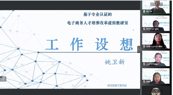 2022年7月9日,电子商务专业全体教师参加由东华大学姚卫新教授主持的教育部“基于专业认证的电子商务人才培养改革虚拟教研室”的启动活动,并参与了教研室的第一次教学研讨活动,我校电子商务专业是该虚拟教研室的成员单位。出席本次活动的有我校和东华大学、西昌学院、浙江师范大学、华中师范大学、北京林业大学、华北电力大学、滇西应用技术大学、上海对外经贸大学、上海商学院、上海立信会计金融学院的11所成员单位的电子商务教研室同仁。
