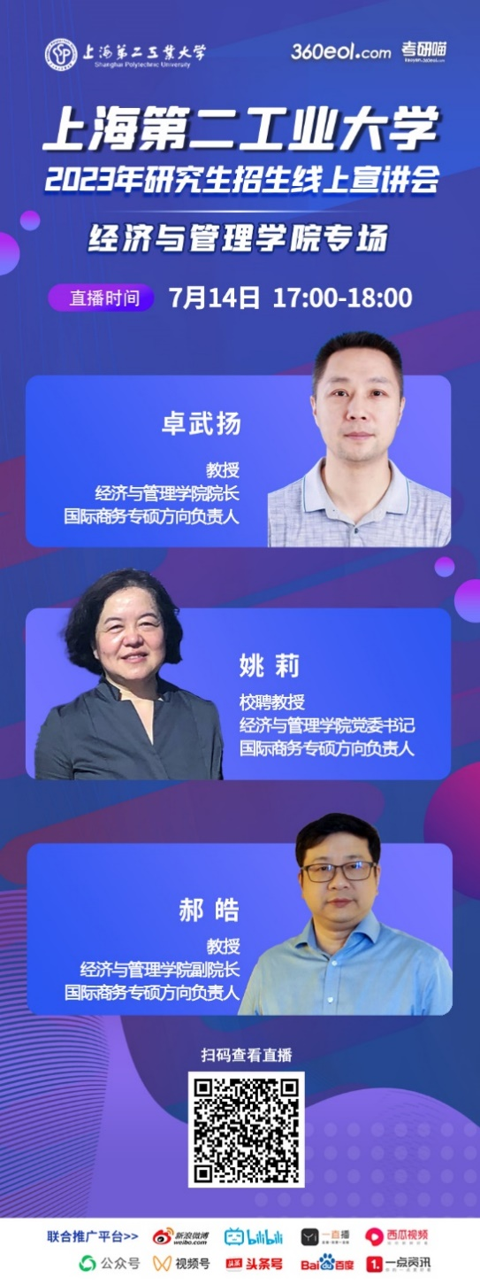 2022年7月14日,在上海第二工业大学研究生部的统一组织下,经济与管理学院参加360公司组织的考研喵线上宣讲。本次宣讲会旨在为广大学子解读2023年上海第二工业大学国际商务专业硕士招生政策,深入了解我们的学院、专业、学生与招生政策,提升同学们报考该专业的积极性。本次宣讲会采用线上直播的方式进行,直播间来访人数总计达到7000余人。