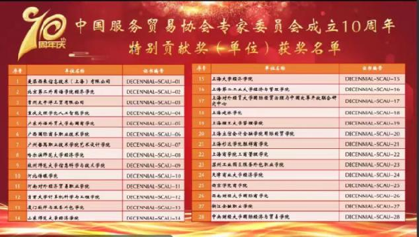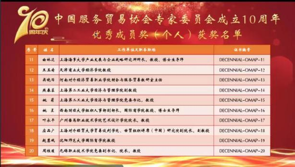12月2日,经管学院党委书记姚莉参与专题论坛“新商科人才培养与产教融合论坛”,并作为论坛嘉宾做报告“产业学院建设与人才培养”,同时在中国服务贸易协会专家委员会10周年专题中,经管学院获得特别贡献奖(集体),姚莉、燕春蓉老师获得优秀成员奖(个人)。