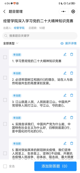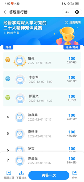 2022年10月16日以来,经管学院党委组织全院教职工开展多种形式的学习宣传贯彻党的二十大会议精神的系列活动。为营造学习宣传贯彻党的二十大精神的浓厚氛围,进一步激发学院教职工全面、系统、深入学习领会党的二十大精神,引导大家自觉把思想和行动统一到党的二十大精神上来,把力量凝聚到党的二十大确定的各项任务上来,学院工会配合学院党委开展了一场形式新颖的学习主题活动,举办面向全院教职工的“深入学习党的二十大精神知识竞赛”。全院教职工学习热情高涨、积极参与答题活动。通过此次知识竞赛,不仅进一步检验了全院教职工对党的二十大报告的学习效果,也达到了以赛促学、以学促行的预期目的,掀起学习党的二十大会议精神的高潮。