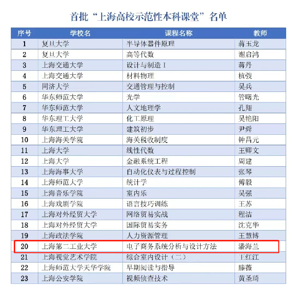 近日,市教委公布了《上海市教育委员会关于公布首批“上海高校示范性本科课堂”名单的通知》,我院潘海兰副教授的《电子商务系统分析与设计方法》课3083程成功入选上海市首批“上海高校示范性本科课堂”。