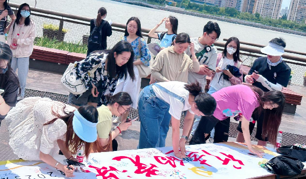 行走的沿途,“人民城市人民建,人民城市为人民”的标语吸引了大家的目光, 这是2019年11月2日习近平总书记在上海考察时来到杨浦滨江,提出的人民城市重要理念。毕业生党员们在此合影留念并且开展了行走的党课签名和印手印活动,为此次行走中的党课增添更强的互动性。
