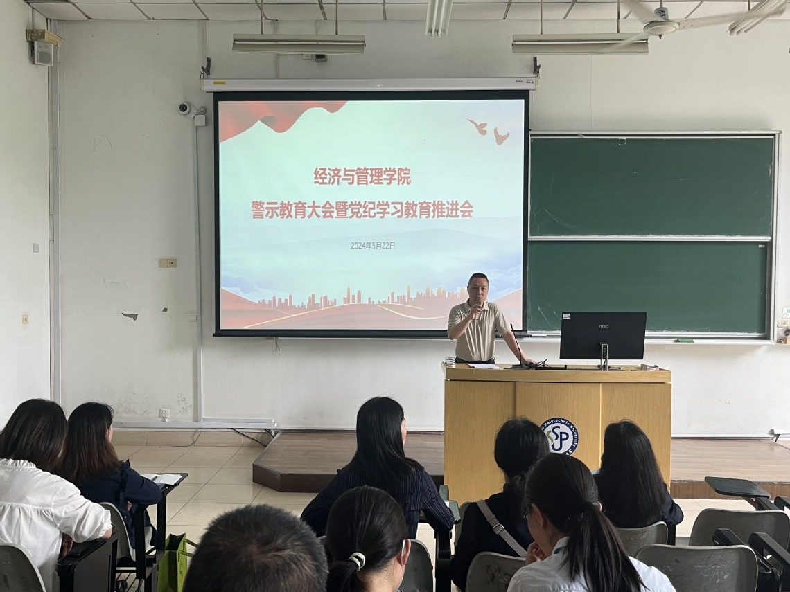 5月22日,经济与管理学院在6302教室召开全面从严治党警示教育大会暨党纪学习教育推进会,学院班子成员及全体教职工参加大会。会议由学院党委副书记、院长卓武扬主持。