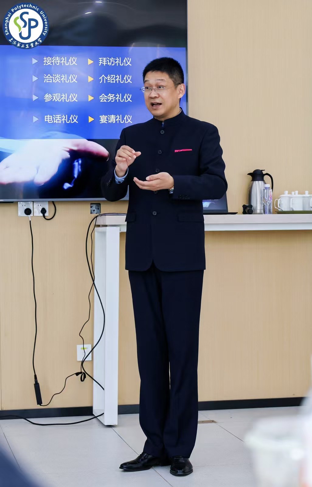 在职场交往与商务接待实操方面,华老师既拆解日常会面、微信沟通等场景的实操规范;又详细示范引导礼、递物奉茶等标准动作,强调 “左手托底、右手扶侧”、“五指并拢、掌心朝上”等尊重细节;还系统讲解了车辆座次安排、主席台排位规则逻辑以及敲门礼仪等容易被忽视的细节。